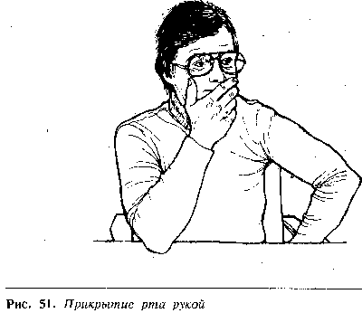 Одной из наиболее удручающих картин для выступающего является вид аудитории, где все до одного держат руки у рта во время сто выступления. В небольшой аудитории или при общении с глазу на глаз будет разумно приостановить свое сообщение и обратиться к аудитории с вопросом: «Не желает ли кто-нибудь прокомментировать сказанное мной?» Это позволит аудитории высказать вес свои возражения, а вам даст возможность уточнить свои высказывания и ответить на вопросы, когда человек лжет, покрывает ложь или дает лживые свидетельские показания. Эти жесты могут также обозначать сомнение, неуверенность, вранье или преувеличение реального факта.