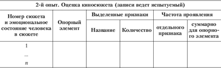 Инструкция испытуемым. Вам будут предложены киносюжеты, где изображены люди, испытывающие разные эмоции. Ваша задача состоит в том, чтобы, выделив опорные элементы и экспрессивные признаки, зафиксировать в протоколе частоту появления каждого признака в киносюжете.