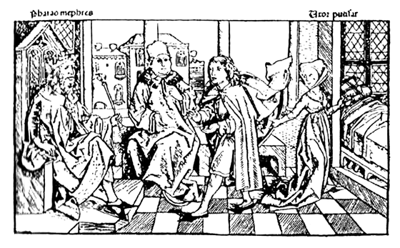 Рис. 3. Иосиф сумел объяснить фараону его сон, поставивший в тупик норных мудрецов, поскольку понимал, что сновидения имеют символическую природу и их нельзя принимать буквально. («Иосиф, толкует фараону его сон». «Нюрнбергская Хроника» Шеделя, 1493.)