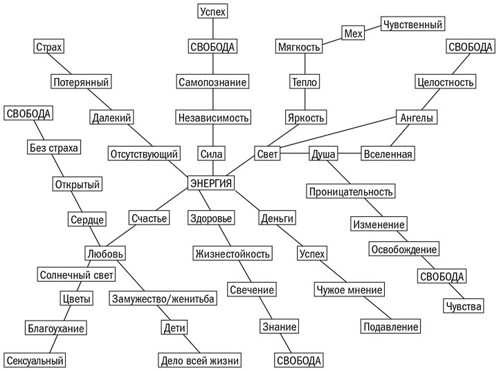 Для начала напишите ключевое слово или фразу посередине страницы и обведите ее. Затем начинайте высказываться по произвольно возникающим ассоциациям. Отделяйте одни мысли от других, преобразовывая их в отдельные слова или короткие словосочетания. Обводите каждое из них кружком и соединяйте линией с предыдущим. Когда возникает новая ассоциация, возвращайтесь к центральному слову и начинайте новый эпицентр. И так по всей странице. Продолжайте создавать кластер, пока не исчерпаете все возможности или не почувствуете потребность перейти от беспорядочности ассоциаций к ясному и направленному осознанию.