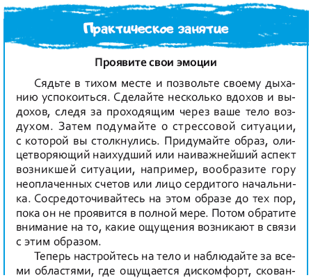 Дозволение эмоций – практика осознанности, при которой вы намеренно направляете внимание на эмоции с установкой на открытость и любознательность. Вы также отмечаете различие между самой эмоцией и вашим отвращением к ней или суждениями о ней и пытаетесь легче относиться к своим суждениям. Если вы будете практиковать это упражнение несколько раз в неделю, то лучше познакомитесь и свыкнетесь со своими эмоциями и сопровождающими их ощущениями в теле, как будничными, так и вызванными стрессом. Состояние осознанности поможет вам замедлиться и создаст ощущение спокойствия, благодаря чему уменьшится вероятность того, что вы будете действовать импульсивно, потеряете голову, запаникуете.