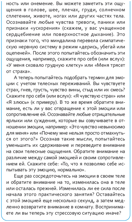Если миндалина призвана защищать нас, тогда почему мы не можем просто прислушиваться к ее сигналам о тревоге и подчиняться ее побуждению к действию? Несмотря на то что эта стратегия может работать в чрезвычайных ситуациях, например, когда кто-то подкрадывается к вам сзади в темном переулке ночью или когда вы встречаете на тропинке гремучую змею, в остальных ситуациях слепое подчинение миндалине может сильно помешать достигнуть своих долгосрочных целей. Проблема состоит в том, что механизм миндалины снабжен переключателем с режимами «включить» и «выключить», а не с градуированным диском. Он реагирует по типу «все или ничего». Но стрессы современного мира сложны. Бегство, драка и оцепенение приносят немного пользы, когда вы сталкиваетесь с таким стрессором, как одиночество, безработица, неоплаченные счета или трудные переговоры. Но если вы принимаете эмоции, если не действуете импульсивно и не отталкиваете их, то они могут предупредить вас об угрозе или важном факте, на который следует обратить внимание.