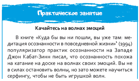 Освоив технику скольжения на эмоциях, вы сможете начать использовать ее, когда почувствуете, что возникла неприятная эмоция, или когда вам нужно сделать нечто, из-за чего вы чувствуете себя некомфортно. Всякий раз, когда вам приходится спорить с кем-нибудь, заполнять налоговую декларацию, выступать с речью, идти на первое свидание, сдавать письменный экзамен или проходить собеседование, осознавайте чувства в своем теле и называйте эмоции. Облекая эмоции в слова, вы в то же время заставляете правое полушарие мозга (ориентированное большей частью на пространственное, целостное восприятие) работать в одной связке с левым полушарием (ориентированным большей частью на язык и элементы картины мира). Так вы можете задействовать целиком весь мозг и сделать свою реакцию на стрессор более уравновешенной.