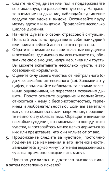 Дозволение эмоций поможет вам заметить, понять и описать свои чувства в отношении стрессовой ситуации. Если вам иногда становится страшно при мысли о том, что какая-то эмоция будет продолжаться вечно или сведет вас с ума, то нижеследующая практика поможет понять, что всякая эмоция временна, что все испытываемые вами эмоции достигают пика, а затем угасают.