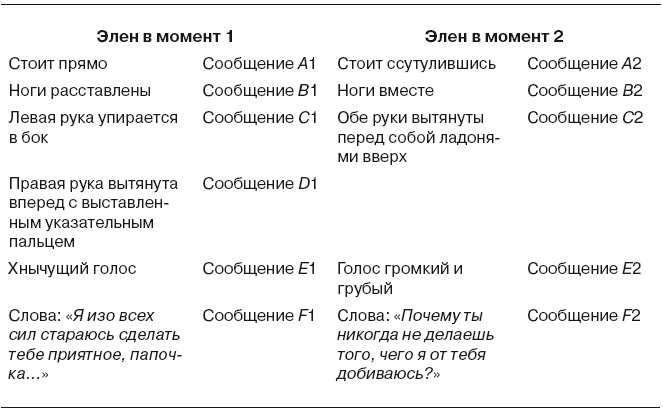 В то же время если применить модель, предложенную нами, то анализ коммуникации Элен и ее отношения к своему отцу не вызывает никаких затруднений. Как в момент 1, так и в момент 2 поведение Элен было неконгруэнтным, в обоих множествах парасообщения не согласуются между собой. Их отношения можно описать следующим образом: