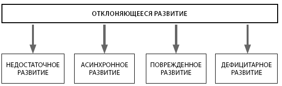 Мы выделяем четыре типа отклоняющего развития: недостаточное, асинхронное, поврежденное и дефицитарное (рис. 2.1).