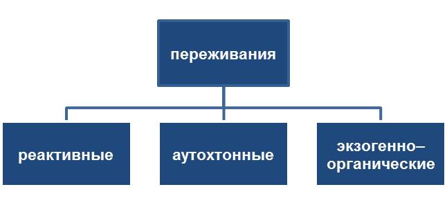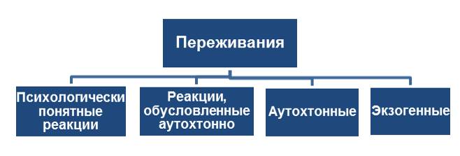 И мы теперь знаем, что есть переживания–реакции, возникающие в ответ на внешние обстоятельства и от этих обстоятельств зависящие. И есть аутохтонные переживания, возникающие феноменологически «на ровном месте», без причины, или, во всяком случае, без жесткой связи с внешними событиями.