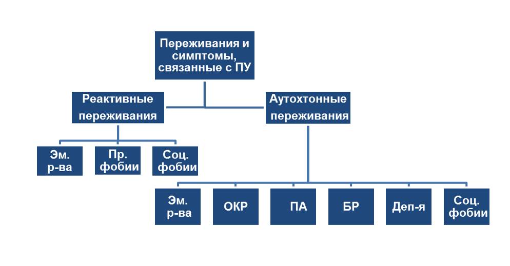 Деперсонализационное, бредовое расстройства, панические и обсессивно–компульсивные расстройства обычно относятся ко второй группе. То есть являются аутохтонно возникающими симптомами. Простые (изолированные) фобии, агорафобии, как правило, относятся к первой группе, то есть являются реактивными. А вот, что касается тревожно–депрессивных состояний и социофобий, то эти проявления могут относиться как к первой группе, так и ко второй.