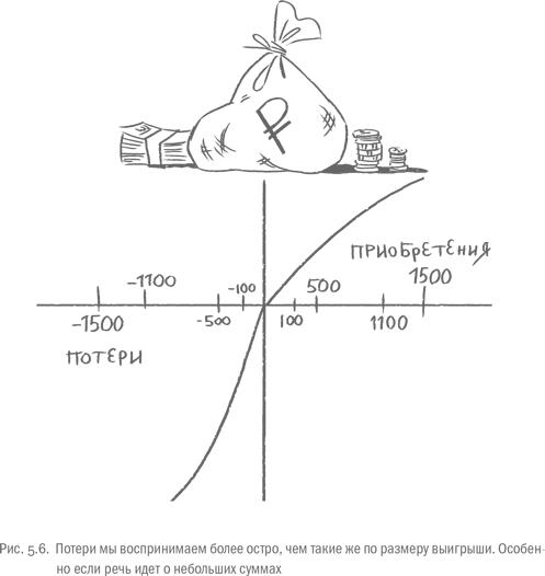 Канеман и Тверски вывели зависимость, которой подчиняются наши решения. Если расположить ее на оси выбора, где слева находятся потери, а справа – выигрыши, то зависимость будет иметь форму латинской буквы S. В районе нулевой точки (нейтральный результат) кривая идет круче, т. е. субъективно потерять 500 рублей вместо 100 гораздо болезненнее, чем потерять 1500 рублей вместо 1100. С выигрышем то же самое. При этом левая часть кривой (восприятие потерь) идет заметно круче правой, т. е. боль от утраты чего-то сильнее радости от приобретения того же самого. Канеман и Тверски связывают излишнюю чувствительность людей к проигрышам с так называемым страхом потери (по-английски – loss aversion) – нашим категорическим нежеланием расставаться с чем угодно. Эволюционно страх потери вполне объясним: если ты прямо сейчас лишишься тушки зайца, то точно останешься без тушки, т. е. голодным. Если тебе предлагают пойти куда-то и получить тушку, то вовсе не факт, что она там будет, поэтому вероятность поесть остается под вопросом. Перспектива утратить что-то вызывает яростный протест миндалины: люди, у которых эта область повреждена, страха потери не испытывают [30].