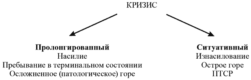 В психологической литературе тема кризисов раскрыта достаточно хорошо[111]. Описываются возрастные, семейные кризисы, кризисы созависимых отношений, подробно раскрываются особенности течений кризисных состояний.