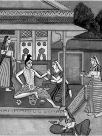 Затеяв с ней игру или развлечение, пусть он возьмет ее за руку, показав, что сделал это умышленно. Пусть он обнимает девушку, и пусть это будет касание или любое другое объятие, описанное в надлежащем месте (Часть 2, глава 2). Пусть он вырежет из листа дерева и покажет девушке силуэт соединенной пары или подобное изображение, потом через время еще одно. Во время купания в реке пусть мужчина нырнет неподалеку от девы и незаметно подплывет к ней. Пусть он расскажет девушке о страданиях, которые испытывает от любви к ней. Пусть он поделится с ней чудесным сном, который он видел, как будто о другой женщине. На вечеринках и пирушках с равными себе пусть мужчина сядет рядом с любящей девушкой, чтобы касаться ее при малейшем случае; пусть он расположит свою ступню так, чтобы ласкать пальцы ног и ногти девушки; если она принимает эти знаки внимания, пусть мужчина погладит ей стопу и пальцы ног рукой. Пусть он прижмет ее руку пальцами своих ног, если ей случится омывать его ноги. Что бы ему ни пришлось брать у девушки и что бы мужчина ей ни давал, пусть он всем своим видом показывает, как страстно влюблен.