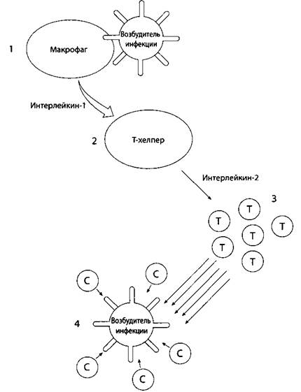 Рис. 25. Каскад клеточного иммунитета. (1) Возбудителя инфекции атакует моноцит особого типа, который называется макрофагом. (2) Макрофаг сообщает о возбудителе инфекции клетке Т-хелперу (тип лейкоцита) и вырабатывает интерлейкин-1 (IL-1), стимулирующий активность Т-хелпера. (3) ЗатемТ-хелпер вырабатывает интерлейкин-2 (IL-2), который запускает распространение!- клеток. (4) Это приводит к распространению лейкоцитов другого типа, цитотоксичных Т-киллеров, и они уничтожают возбудителя инфекции