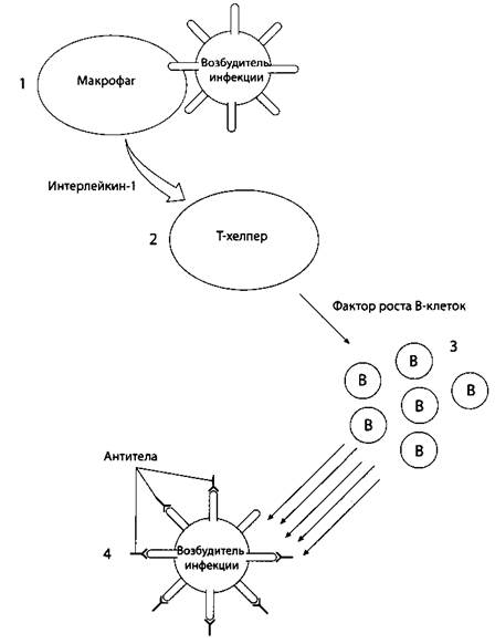 Рис. 26. Иммунный каскад на основании антител. (1) Возбудитель инфекции сталкивается с макрофагом. (2) Макрофаг сообщает о возбудителе инфекции клеткам Т-хелперам, и они вырабатывают интерлейкин-1 (IL-1), стимулирующий активность Т-хелперов. (З)Т-хелперы вырабатывают фактор роста В-клеток, и это запускает дифференциацию и быстрое распространение лейкоцитов другого типа, В-клеток. (4) В-клетки вырабатывают специфические антитела, которые присоединяются к белкам возбудителя инфекции, подготавливая его к уничтожению многочисленной группой белков, циркулирующих в крови, которые называются комплементом