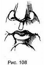 Если маленький рот чаще закрыт (рис. 108), то его хозяин — человек уравновешенный, способный прийти на помощь, он как в работе, так и в чувствах, сохраняет серьезность, хотя в его душе пылает огонь. Расширение ротовой щели, особенно с отвисанием нижней челюсти, выражает снижение психической активности.