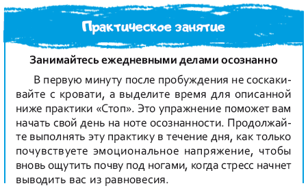 ? Выполняйте упражнение «Стоп» перед тем, как снять трубку телефона, проверить электронную почту или войти в социальные сети. Установите временные рамки для этих задач и не позволяйте им толкать вас к бессознательному, реактивному поведению, уводящему вас от самого важного.