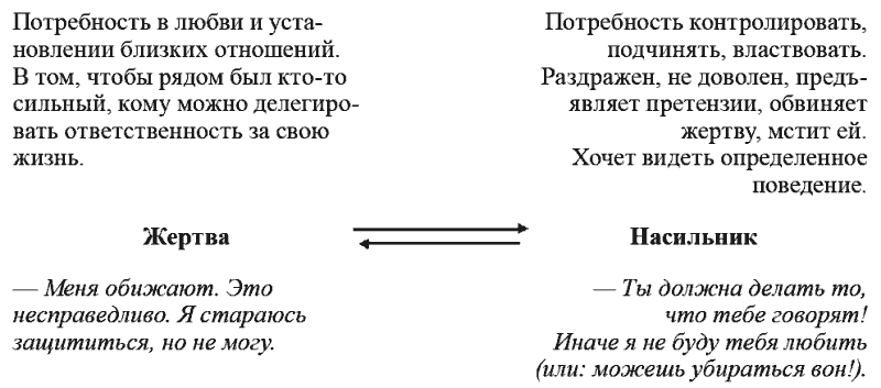 Для того чтобы понять суть насилия более глубоко, необходимо вспомнить тему взаимозависимости манипулятивных ролей, которую мы рассматривали в главе про манипуляции. Обсуждалось, что ни жертва, ни насильник не могут существовать в одиночестве. Потому что их потребности могут быть удовлетворены только при условии присутствия второй роли. Таким образом, возникающая сцепка характеризуется устойчивыми связями со стороны каждого участника взаимодействия.