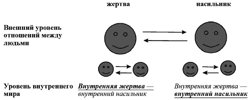 Кроме того, говорилось о том, что эти роли существуют не только во внешнем мире в виде людей (начальник – насильник; жертва – подчиненный), но и в пространстве внутреннего мира человека (присутствие внутренней сцепки жертвы и насильника).