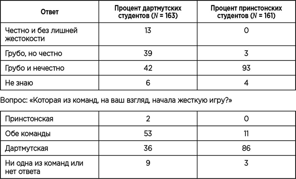 Исследование Хасторфа и Кэнтрила[65] предоставляет систематические данные касательно того, чем может обернуться такая реакция на вынужденное знакомство с информацией, способной породить диссонанс.