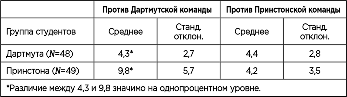 Сравнение таблиц 15 и 16 показывает, что студенты просмотрели видеозапись сквозь призму, консонантную их собственным убеждениям. Дартмутские студенты, у которых имелось групповое мнение, что матч не был слишком грубым и что обе команды виновны в жесткой игре, увидели меньшее количество нарушений правил, практически поровну распределив их между обеими командами. Студенты Принстона, исходно придерживавшиеся мнения о том, что игра была грубой и нечестной и что виновен в этом Дартмут, обнаружили большее число нарушений, причем дартмутской команде они приписали почти вдвое больше нарушений, чем своей. Конечным результатом явилось то, что им удалось избежать возникновения диссонанса или его увеличения.