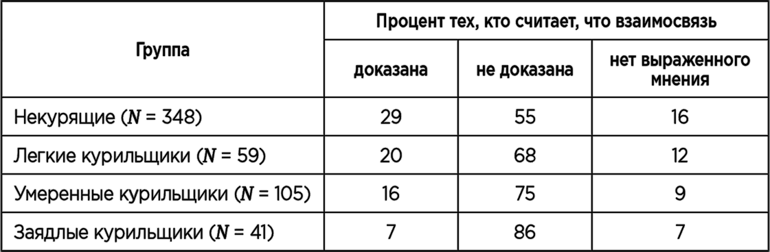 Соответствующие данные были получены в результате исследования, проведенного организацией Миннесота-Опрос в феврале 1954 года[67]. В рамках этого исследования в дополнение к вопросу об отношении к курению каждый респондент отвечал на следующий вопрос: «Недавно были опубликованы результаты научных исследований, проведенных ради того, чтобы определить, может ли курение стать причиной рака легких. Как вы полагаете, была ли доказана связь между курением и раком легких?» Для нас в этой ситуации интерес представляет сравнительный анализ курильщиков и некурящих в плане того, признают ли они доказательства связи курения с раком.