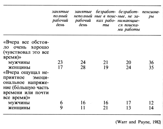Удовлетворенность состоянием здоровья и жильем в семьях безработных также невысока. У них меньше положительных эмоций и стрессов, связанных с работой, но значительно больше вызванных отношениями в семье (Campbell, 1981; Warr and Payne, 1983).