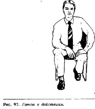 Один из наиболее ценных жестов, который можно научиться распознавать — это выражение готовности у стоящего человека. При презентации товара, например, если потенциальный покупатель делает такой жест в конце презентации, и переговоры успешно дошли до этой точки, агент по продаже может просить заказ и может ожидать его получения. Видеозапись страховых агентов, ведущих переговоры со своими клиентами, показала, что каждый раз, когда жест «поглаживание подбородка» (принятие решения) сменялся позой готовности, клиент покупал страховой полис. И наоборот, если при закрытии презентации клиент после поглаживания подбородка принимал позу скрещенных на груди рук, сделка не завершалась успехом. К сожалению, большинство обучающих центров учат агентов только запрашивать заказ, но не учат их наблюдать за позой и жестами клиента. Умение узнавать такие жесты как готовность не только помогает бизнесу, но и помогает привлечь как можно больше людей к этому бизнесу. Сидячая поза готовности также характерна для разгневанного человека, готового на все, даже вышвырнуть вас отсюда. Набор предшествующих жестов позволит вам правильно оценить намерения человека.