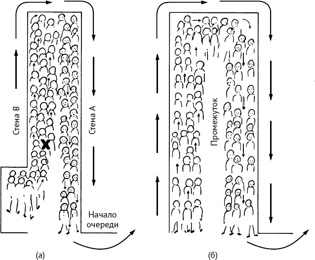 Тех, кто первыми покупал билеты, первыми впускали в зал согласно негласному закону, общепринятому среди завсегдатаев театра. Когда двери в зал открывались, зрители входили в зал в том порядке, в котором прибыли в театр, и выбирали себе места. Однако коридор, в котором создавалась двойная очередь, был необычайно узок, поэтому, если зритель X хотел пройти предписанный путь, ему зачастую приходилось задевать и толкать других зрителей, продвигавшихся в противоположном направлении. Толкучка в очереди нарастала, и в конце концов люди, стоявшие вдоль стены В, начинали разворачиваться и тоже проходить в зал – что нарушало все установленные нормы. В результате последними в зал входили те, кто оказывался в середине очереди. Такое происходило постоянно. Решением проблемы стало расширение коридора (рис. 21б) – между изгибами очереди образовался промежуток, зрители перестали толкать друг друга и теперь входили в зал чинно и с соблюдением всех приличий.