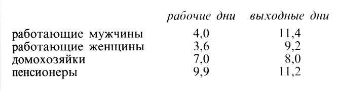 На наш взгляд, лучший способ выяснить, на что люди расходуют свободное время, - попросить некоторых из них все тщательно записывать, то есть вести дневник. Такие записи ведутся обычно на протяжении недели и более. В 1965-1966 гг. в Америке было проведено исследование, основой для которого послужили подобные дневники. Обнаружилось, что у мужчин ежедневный досуг составлял в среднем 4 часа 46 минут, в то время как у женщин (работающих) - 4 часа 02 минуты (сюда не входит время, затрачиваемое на работу, транспорт, уход за собой, домашние дела). Из этого времени надо вычесть время, затраченное на просмотр телевизионных передач, слушание радио и чтение газет, - у мужчин - 2 часа 28 минут, у женщин - 1 час 36 минут. На социальную активность, спорт, развлечения оставалось для женщин - 1 час 40 минут, для мужчин 1 час 57 минут (Robinson, 1977). В Англии подобных исследований не проводилось. Однако регулярно проводящееся обследование под названием Household Surveys охватывает не менее 25 тысяч семей. Таким образом накопилась достаточно обширная информация о формах проведения досуга. Далее я буду использовать эти данные в качестве основного источника информации. Они дают представление о времени, ежедневно отводимом на досуг (данные на 1982 г.):