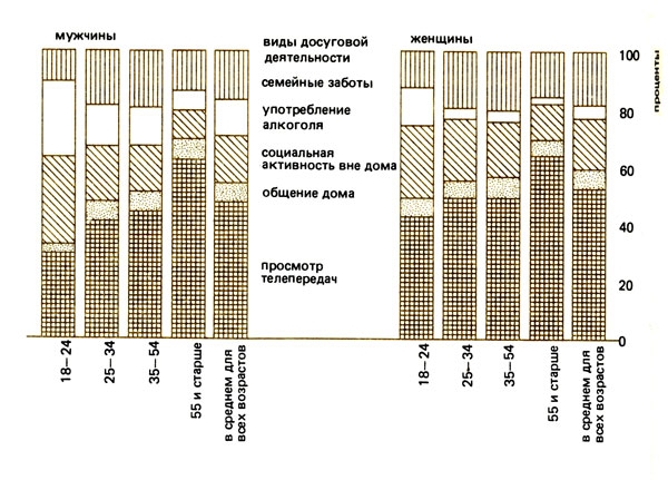 По рабочим дням оно обычно приходится на период с 18 до 22 часов. Рис. 4.1 дает картину распределения вечернего досуга в Англии и Уэльсе (данные на 1978 г.). Особо можно выделить просмотр телевизионных передач, далее - социальную активность вне дома (посещение клубов, танцев, церкви, вечерних занятий и т. д.), потом следуют употребление алкоголя и социальная активность в кругу семьи.
