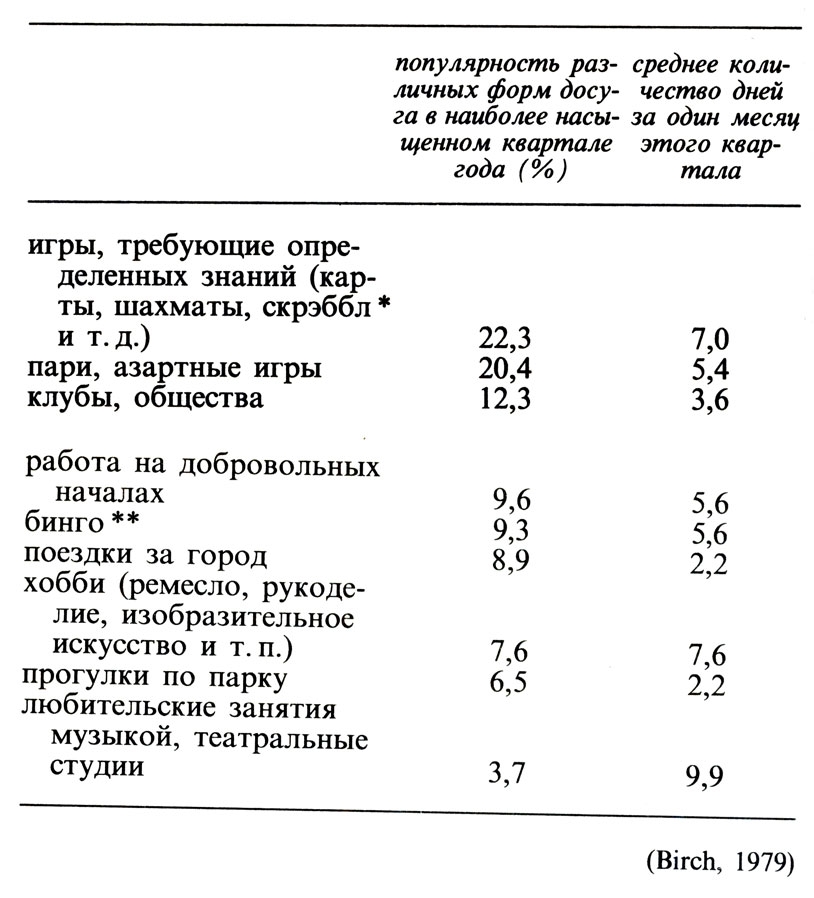 Каким образом проводит свой досуг население Англии? Ответ на этот вопрос мы найдем в табл. 4.3 (исследование проводилось в 1977 г.). В первой колонке показано, какие формы досуга были наиболее популярны на протяжении одного месяца самого насыщенного событиями квартала. Вторая колонка дает представление о том, как часто (на протяжении одного месяца во время самого активного сезона) люди позволяют себе заниматься любимыми видами деятельности.