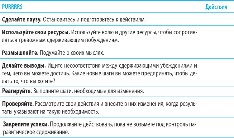 Акроним PURRRRS означает: «сделайте паузу, используйте свои ресурсы, размышляйте, делайте выводы, реагируйте, проверяйте, закрепите успехи» (pause, use your resources, reflect, reason, respond, review, stabilize). Вы можете использовать метод PURRRRS, чтобы реализовать вашу свободную волю для уменьшения ненужной сдержанности. PURRRRS также поможет вам бороться с чувством неадекватности, связанным с подавлением тревоги. Вы также научитесь развивать терпение, решая проблемы, вместо того чтобы автоматически избегать их.