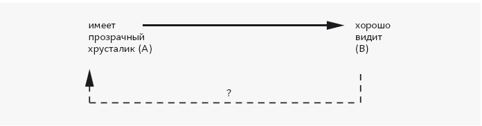 Предположим, у нас есть трое животных, у двоих из которых хрусталик мутный, а у одного – прозрачный. Обладание прозрачным хрусталиком (А) каузирует способность глаза хорошо видеть (В); способность хорошо видеть каузирует способность животного размножаться, помогая ему избежать хищников и находить партнеров. Потомство (АА) тоже имеет прозрачные хрусталики и хорошо видит. Выглядит это так, словно у потомства появились глаза для того, чтобы оно могло хорошо видеть («плохая», телеологическая, ретроактивная причинность), но это иллюзия. У потомства есть глаза, потому что у их родителей глаза видели хорошо («хорошая», обычная, прогрессивная каузация). Глаза потомков выглядят так же, как глаза родителей, поэтому несложно сделать ошибку, назвав случившееся ретроактивной каузацией.