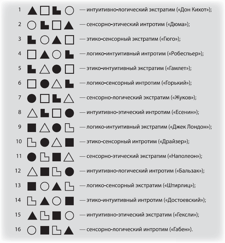 Имена знаменитостей, проставленные в скобках, введены для удобства запоминания, с ориентиром на конкретное историческое лицо, которое с большой долей вероятности обладало соответствующим типом ИМ.