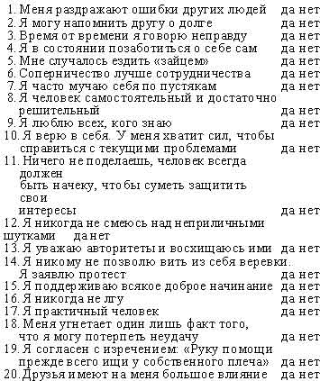 Самый высокий показатель достигнут в счете В: Несмотря на результаты предыдущих двух подсчетов, у вас очень хорошие шансы овладеть ассертивностью. Короче говоря, у вас сложилось мнение о себе и своем поведении, вы оцениваете себя реалистично, а это хорошая база для приобретения какого-либо навыка, необходимого при контактах с окружающими.