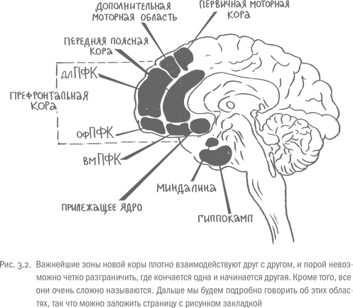 Лимбическая система неразрывно связана с нашей способностью к самоконтролю, и хотя кажется, что вследствие эволюционных причин именно она мешает нам быть волевыми и твердыми в своих намерениях, в действительности это сверхмощная махина, которую можно отлично использовать для укрепления силы воли. Но чтобы понять, каким образом это сделать, сперва разберемся, как пытается сдерживать наши неуемные порывы продвинутая новая кора.