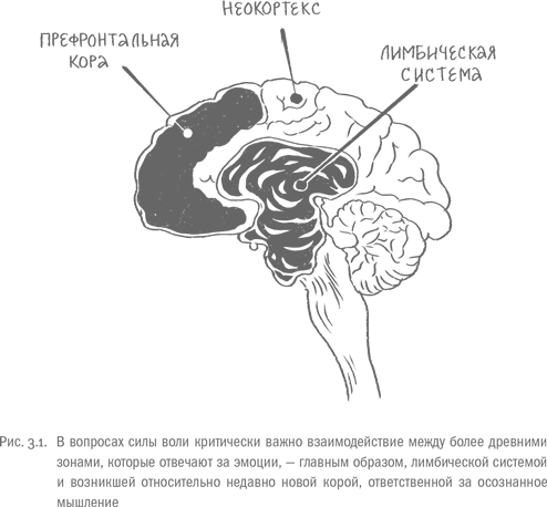 Супермаркеты, фастфуд, наркотики, продажная любовь и компьютерные игры – изобретения недавние, и система эмоций еще не научилась правильно на них реагировать. Возможно, через пару миллионов лет у наших потомков разовьется способность испытывать моментальное отвращение при виде полок со сникерсами или убегать, завидев открытую страницу соцсетей, но пока мозг по умолчанию считает благом то, что мы обычно называем соблазнами. И эти заложенные в «железе» настройки здорово мешают нам проявлять силу воли. Но, к счастью, продвинутые млекопитающие, в том числе человек, обзавелись так называемой новой корой – «интеллектуальной» составляющей великого мозга. Благодаря ей мы думаем, разговариваем, воспринимаем себя как личность, творим, анализируем, считаем, планируем и изобретаем. И где-то там, в глубине мозга, на пересечении его новых и старых областей скрыта наша способность держать в узде порывы (с переменным успехом), подчиняя древние простые желания сложным современным целям.