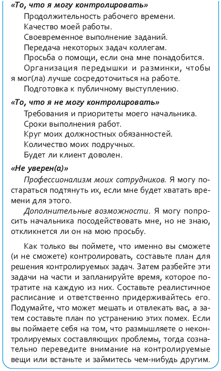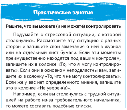 Как вы избегаете ловушек неадекватно воспринимаемого контроля, в то же время получая пользу от адекватно воспринимаемого контроля, эффективно противодействующего стрессу? Один из способов состоит в том, чтобы осознать свой контроль над процессом или результатами своих усилий. Например, если вы организуете благотворительную акцию или школьное мероприятие, то можете напомнить себе о том, что вы – собранный человек, что вы дали себе достаточно времени и получили неплохую помощь, поэтому понимаете, что мероприятие будет успешным даже при наличии каких-то недочетов. Это чувство может удержать вас от бесконечных телефонных звонков, электронных писем и переговоров с поставщиками. Когда я переехала из Сан-Диего в округ Марин (штат Калифорния), чтобы начать там практику клинической психологии, я не знала ни тех мест, ни тамошних жителей. Тем не менее я была уверена в своих знаниях, профессионализме и способности найти клиентов. Я также знала, что для того, чтобы создать свое дело, необходимо проявить настойчивость. Благодаря реалистичным ожиданиям и уверенности в своих способностях мое эмоциональное напряжение уменьшилось. В нижеследующем практическом занятии у вас будет возможность определить, что в стрессовой ситуации поддается вашему контролю, и разработать план действий.