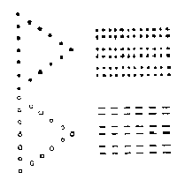Вторая форма доминирования целостной структуры перцепта над его отдельными элементами выражается в том, что если заменить отдельные элементы, но сохранить соотношения между ними, то общая структура образа остается неизменной. Так, еще Х. Эренфельс подчеркнул, что при проигрывании одной и той же мелодии на разных инструментах или в разных регистрах она воспринимается как та же самая. Между тем, в каждом из таких вариантов проигрывания все звуки изменяются по характеристикам высоты и тембра. Эта независимость восприятия всей структуры от изменения характеристик ее отдельных элементов и выражает вторую форму примата целого над частями. В области зрительной перцепции эта форма доминирования отчетливо демонстрируется таким, например, фактом, как сохранение общей структуры восприятия изображения при замене пространственных характеристик его отдельных элементов, которые могут быть представлены точками, черточками, кружками, крестиками и т. д. (рис. 7).