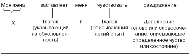 Заметим, что данная поверхностная структура представляет неясный образ того, как один человек (моя жена) совершает какое-то действие (неконкретное), которое необходимым образом принуждает другого человека (меня) испытывать определенные чувства (раздражение). Неправильные поверхностные структуры, относящиеся к данному классу, можно идентифицировать по признаку соответствия одному из двух лингвистических форматов, которые в общем виде можно представить формами (А и Б).