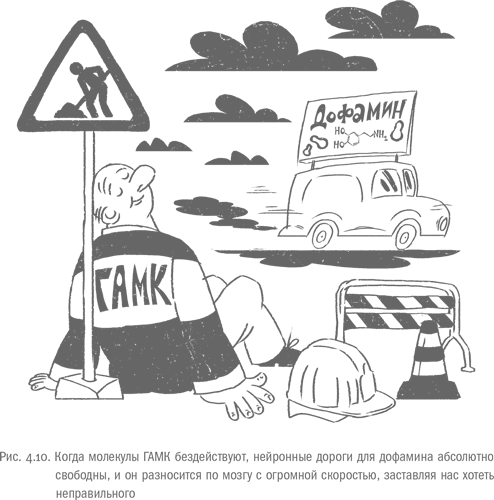 По важности для человека ГАМК вполне может сравниться с серотонином и дофамином. Эта небольшая молекула – главный тормозной медиатор центральной нервной системы. Если представить, что нервные импульсы распространяются по нейронным путям в мозгу так же, как автомобили ездят по магистралям, то молекулы ГАМК – это дорожные рабочие, которые перекрывают то одно, то другое шоссе. Рецепторы к гамма-аминомасляной кислоте есть на нейронах по всему мозгу, и когда ГАМК с ними связывается, клетка превращается в тупик: дальше нее сигнал не проходит. По этому механизму тормозятся все импульсы, в том числе в системе поощрения и префронтальной коре.