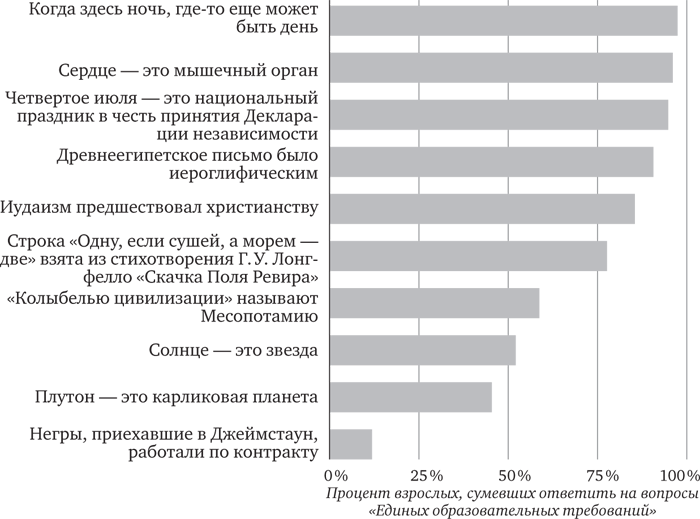 И все-таки основания критиковать «Единые образовательные требования» имеются: в них от учащегося требуется слишком многое, пожалуй, даже невозможное. Я провел исследование, чтобы проверить, знают ли взрослые то, что должен знать первоклассник[26]. В среднем из списка, о котором речь шла чуть выше, взрослый американец сумел ответить на семь вопросов из десяти.