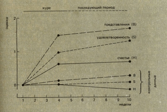 Новозеландский курс по усилению субъективного ощущения счастья у нормальных людей основан в основном на улучшении инсайта и понимания, а также на исправлении иррациональных представлений. Курс рассчитан на восемь двухчасовых занятий в течение двух недель. Результаты проведения этих курсов весьма положительны (см. рис. 11.1, который демонстрирует усредненные оценки, набранные слушателями во время проведения занятий и последующего периода).