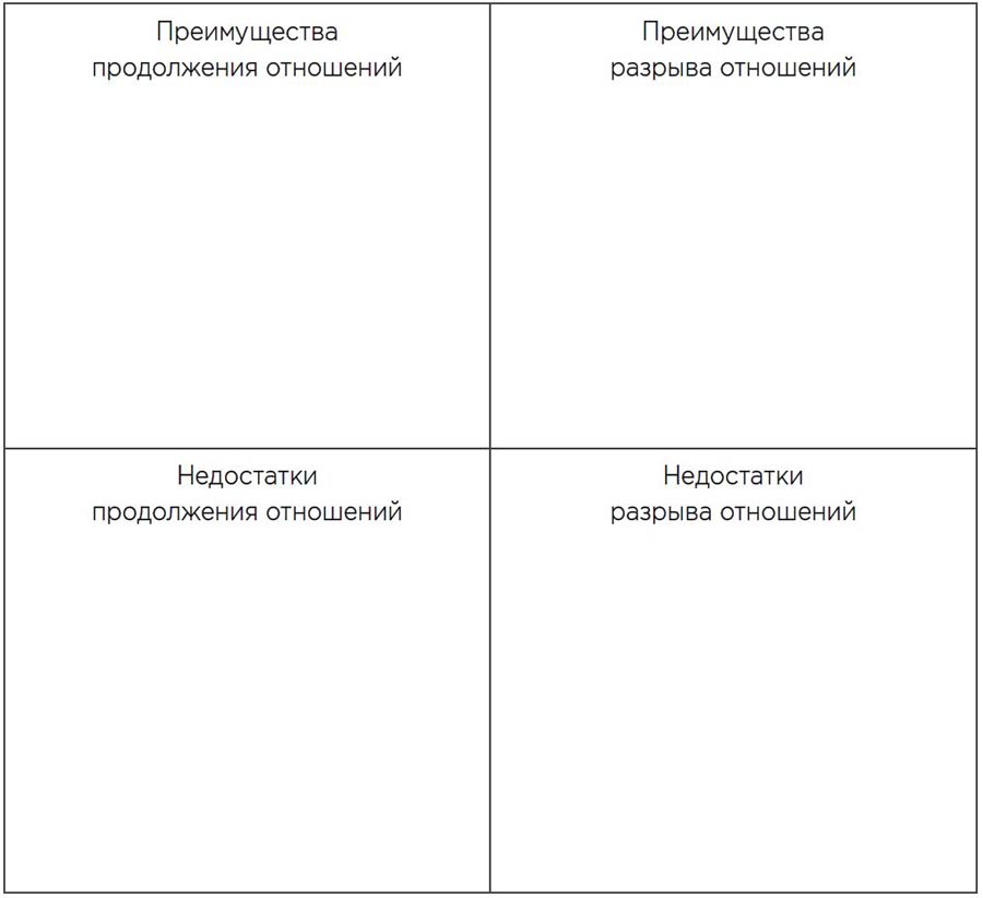Основной процесс беспристрастного консультирования – это тщательно и сбалансированно исследовать все за и против существующих альтернатив (Janis & Mann, 1977). Общая процедура заключается в систематическом обращении к преимуществам и недостаткам каждого рассматриваемого варианта. В ситуации бинарного выбора, например, продолжать отношения или разойтись, матрица решений 2 ? 2 может выглядеть примерно так, как показано в Таблице 17.1. Клетки по диагонали (например, преимущества продолжения отношений и недостатки разрыва отношений) являются комплементарными и могут содержать одни и те же данные. Фактически, для некоторых клиентов может оказаться затруднительным провести различия между ними, поэтому, в данном случае, простой список за и против может оказаться более подходящим. Идея в том, чтобы уделить одинаковое внимание каждой клетке, побуждая клиента назвать полный список для каждой, исследуя каждый элемент посредством проработки и рефлексирования (см. Главу 14).