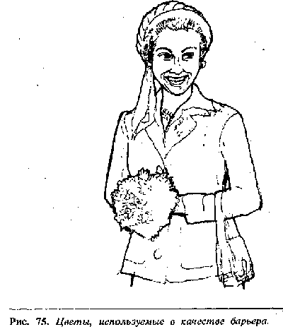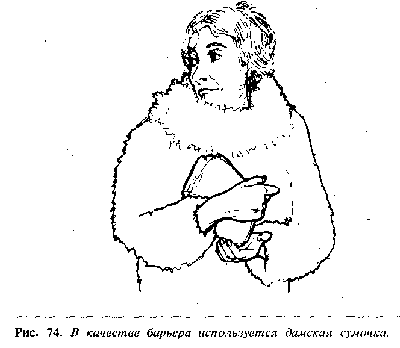 Опытного наблюдателя, однако, эти жесты никогда не обманут, потому что они делаются с одной единственной целью — скрыть взволнованность и нервозность. Хорошим местом для наблюдения этих жестов является то, где люди проходят через группу наблюдающих за ним людей, например, танцевальный зал, где человек направляется к привлекательной молодой особе для того, чтобы пригласить ее на танец, или просторная открытая комната, которую пересекает человек для получения награды. У женщин труднее заметить этот замаскированный защитный жест, потому что они, когда неуверенны в себе, могут держаться за такие предметы, как дамская сумочка — или кошелек (рис. 74).