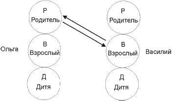 Казалось бы, что в том случае, когда Ольга просит об одолжении, имеет место трансакция В — Р (аргументированное обращение за покровительством), а партнер ей отвечает параллельной трансакцией Р — В (оказывает покровительство). Таким образом, их общение можно представить схемой, показанной на рис. 6.13.