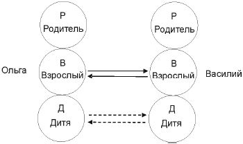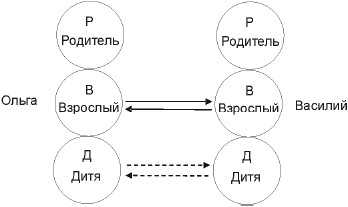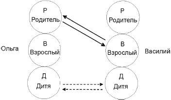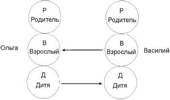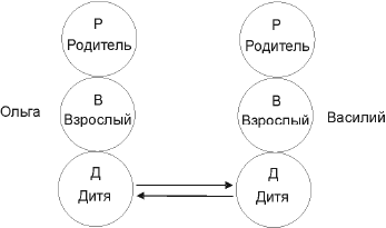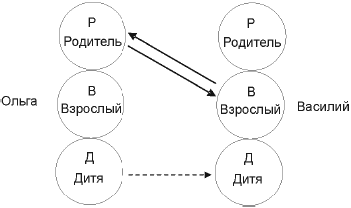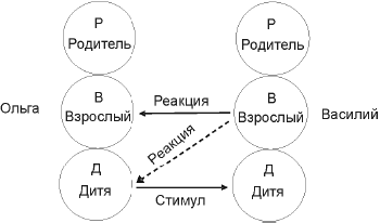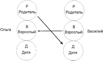 Таким образом, схема, показанная на рис. 6.21, на социальном уровне — полный аналог схемы, приведенной на рис. 6.19, а вот на психологическом уровне наблюдается трансакция В — Д, которая оскорбила Дитя Ольги, после чего на защиту Дитя бросился Родитель, и оскорбил Дитя Василия (см. рис. 6.20). В общем, налицо конфликт.