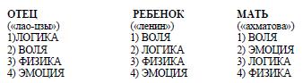 На первый взгляд, при данной комбинации ребенок оказывается, из-за высокостоящей Логики и тождеству по Третьей и Четвертой функциям, ближе к отцу, нежели к матери. Но это видимость. На самом деле мощь 1-й Воли матери, столкнувшая 1-ю Логику отца на Вторую ступень, от чего и образовался новый психотип, такова, что в состоянии поделить взаимопонимание между ребенком и родителями почти поровну. Хотя при данной комбинации и взаимного непонимания в этом треугольнике будет больше, чем достаточно.