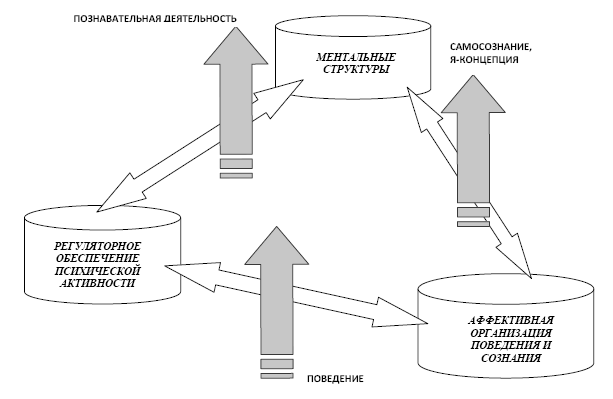 Рис. 1.2. Треугольник взаимодействия компонентов базовой структурной организации психического, определяющих состояние регуляторноволевой, когнитивной и аффективно-эмоциональной сфер и их взаимодействия в структуре познавательной деятельности, поведения и самосознания