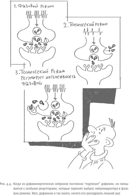 Говоря о снабжении мозга дофамином, специалисты выделяют тоническую и фазовую компоненты. Тонический уровень – сколько дофамина присутствует в щели между нейронами в течение долгого времени, этакий постоянный дофаминовый фон. Под фазовой составляющей подразумевают количество нейромедиатора, которое выбрасывается из дофаминергических нейронов за один раз при их активации. Чем выше ценность какого-нибудь действия, тем больше дофамина будет выброшено в фазовом режиме. Но оказалось, что интенсивность этого выброса зависит не только от привлекательности стимула, но и от количества тонического дофамина [20].