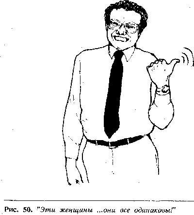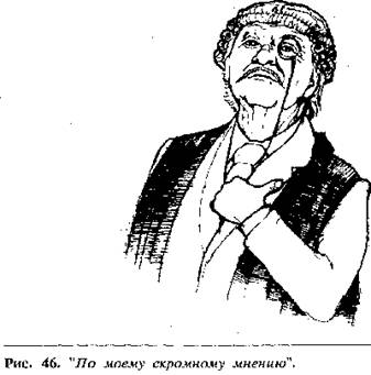 Большие пальцы, обозначающие превосходство, становятся еще более красноречивым жестом в случае, если человек говорит совершенно противоположные жесту слова. Возьмите для примера, ситуацию, когда адвокат, обращаясь к суду мягким низким голосом говорит: «Дамы и господа присяжные заседатели. По моему скромному мнению …» в то время, как большие пальцы его рук отчетливо выделяются, а голова высокомерно откинута назад (рис. 46).